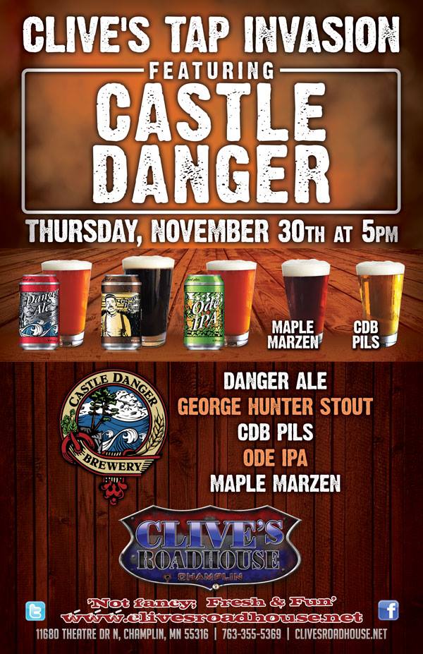 Clive’s Roadhouse in Champlin will be having a tap invasion featuring our dangerously good ales. They will be tapping Danger Ale, George Hunter Stout, CDB Pils, Ode IPA and Maple Marzen. See you there!