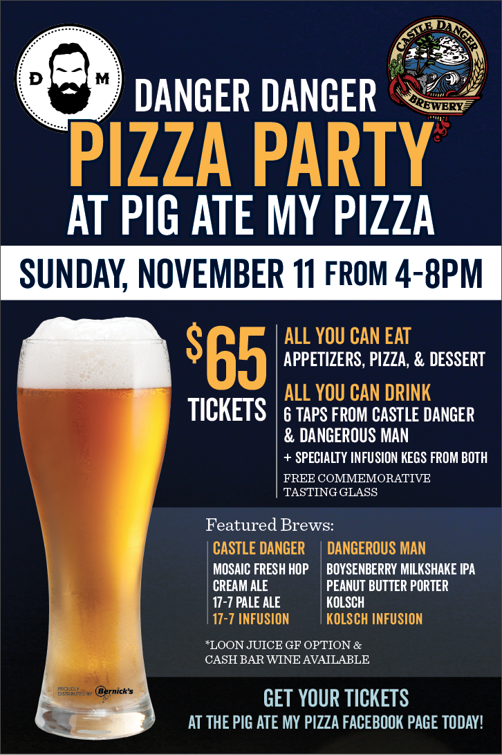 Join us at Pig Ate My Pizza on November 11th as we partner with our friends at Dangerous Man Brewing for a dangerous tap takeover and pizza party. For just $65 you can get all you can eat ‘za, appetizers, dessert, and beer (plus a free commemorative tasting glass).