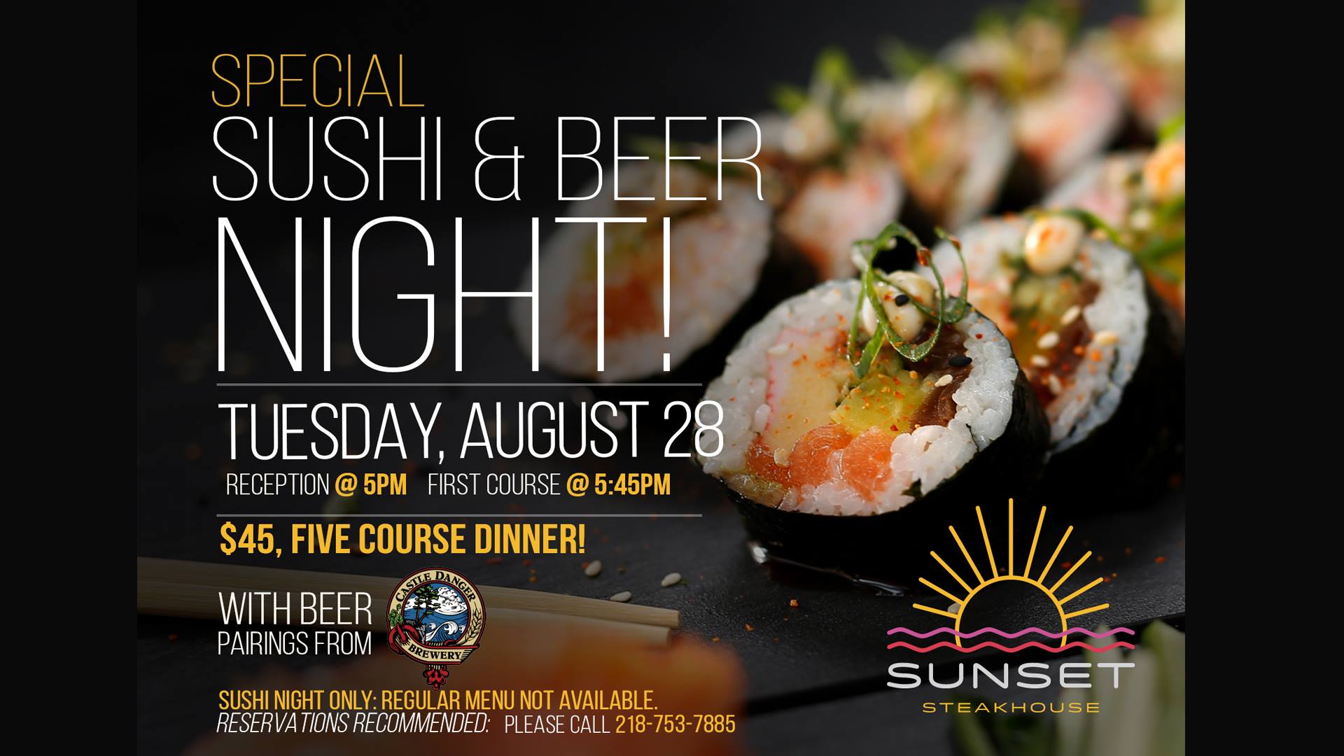 Join us on Tuesday, August 28th at Fortune Bay Casino for a sushi beer dinner! Come and enjoy a 5-course sushi dinner with dangerously good beer pairings prepared by Chef Quaid Fetkenheuer. Reservations are filling up fast! Please call 218-753-7885 to make reservations.