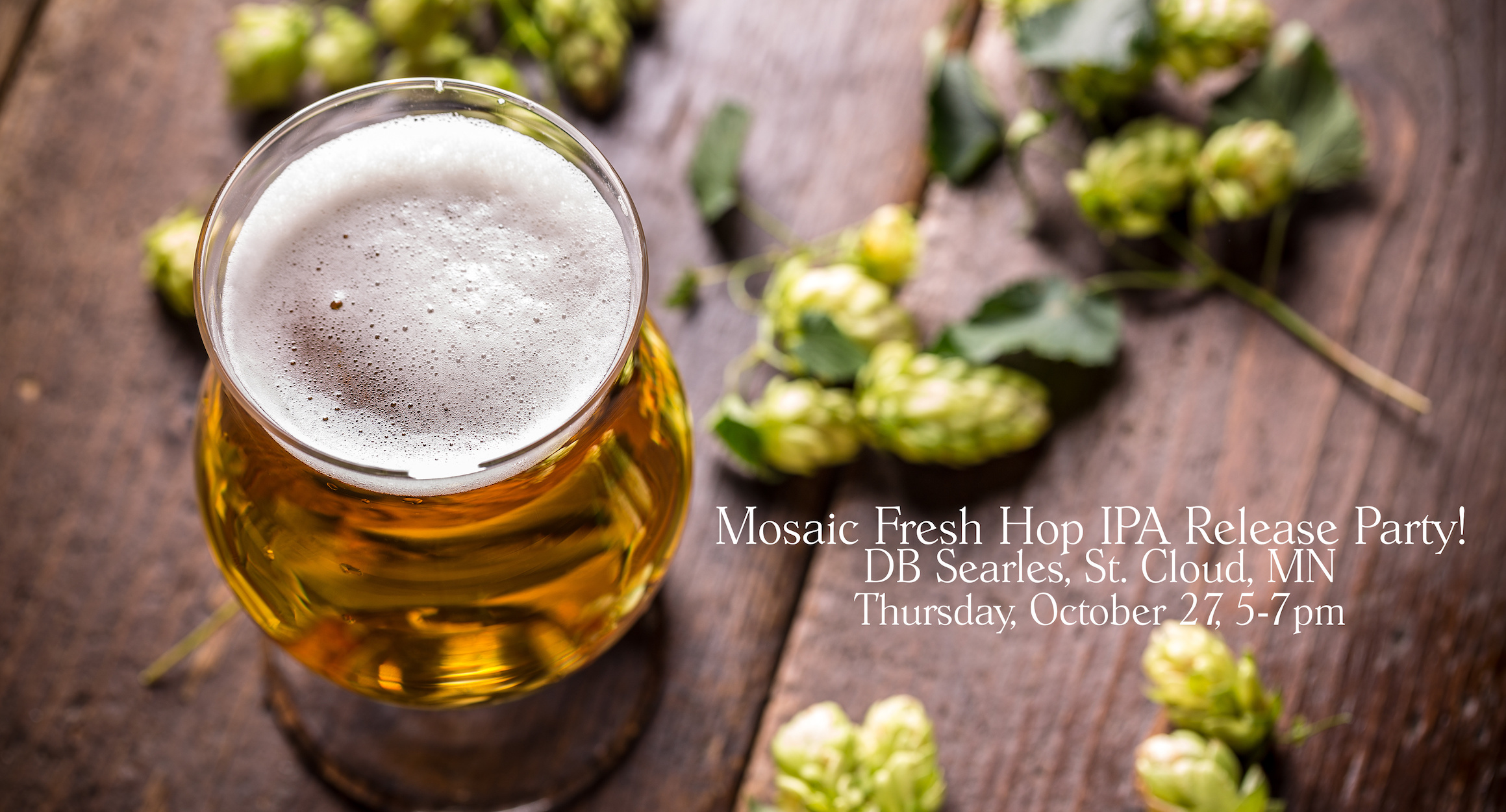 We’ve officially released our Mosaic Fresh Hop IPA and we’re celebrating! If you’re in the St. Cloud, MN area, come to DB Searles on Thursday, October 27th from 5:00-7:00pm to drink some dangerously good Mosaic Fresh Hop IPA with us.