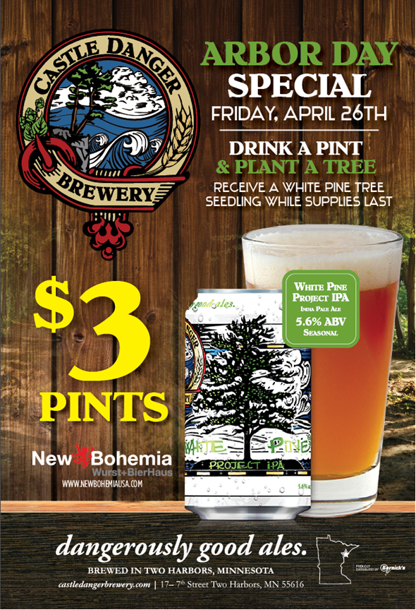 Join us at any of the New Bohemia locations on Friday, April 26th for a White Pine Project IPA tap feature. A select number of white pine seedlings will make their way to each New Boh location for these special events. Buy a pint and plant a tree! White Pine Project IPA is on special for $3 all day long.