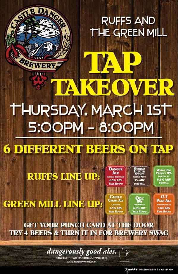 Join us at Ruff’s and Green Mill in Willmar on Thursday, March 1st from 5-8pm for a dual tap takeover! Between the two restaurants, we’ll have 6 beers on tap. It’s bound to be dangerously fun!
