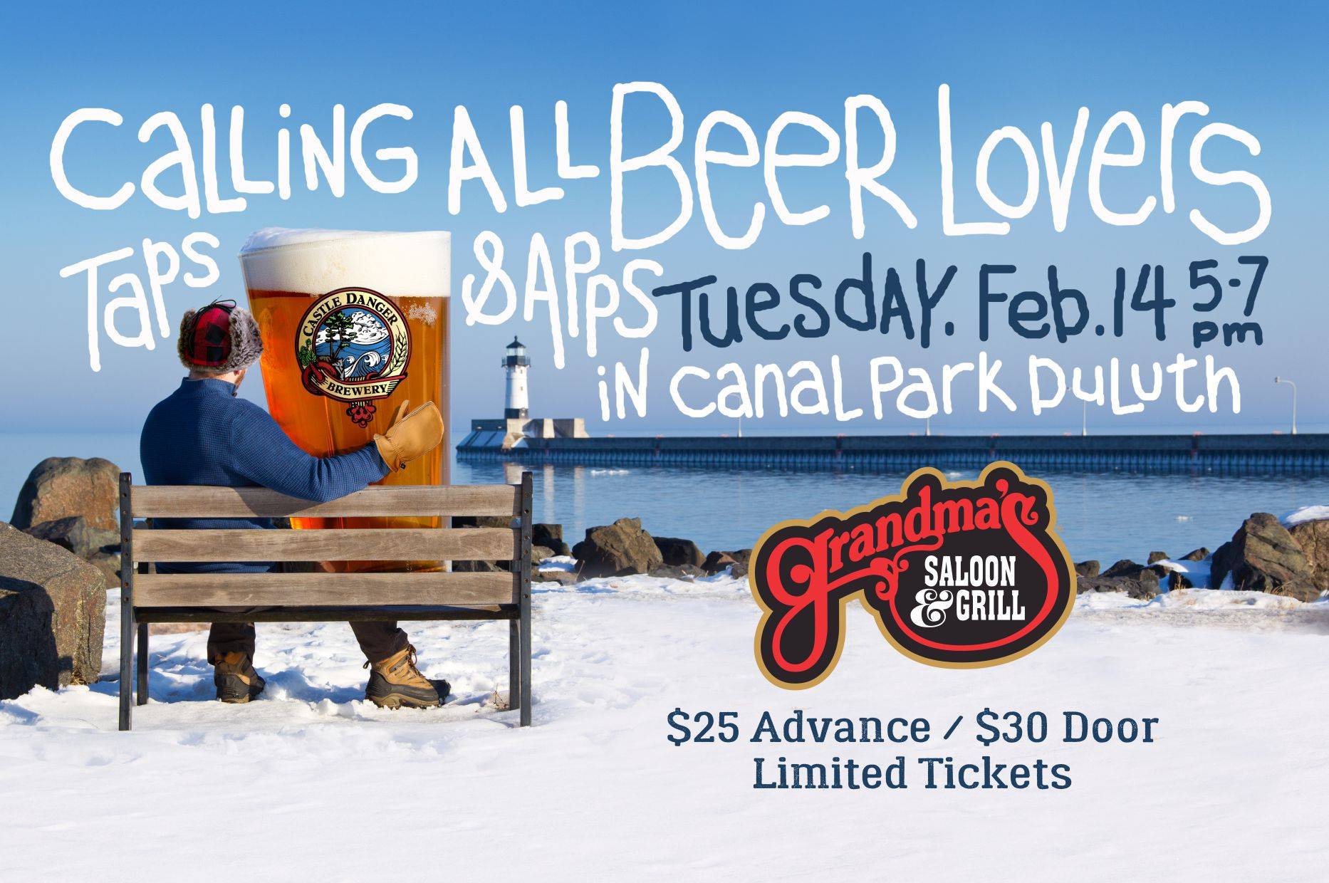 Grandma’s and Castle Danger-The perfect duo! Join us Valentine’s Day, February 14th, from 5:00 pm -7:00 pm for a fun-filled evening of beer tasting and light appetizers. Featuring 5 delicious 5 oz. beer samplings, including a special early release from our Taproom Series; Loch Sloy- Scottish Ale. These beers will be paired with appetizers specially crafted by Grandma’s Executive Chef Dave Rowell. Ticket prices include gratuity and taxes, and are available for purchase at Grandma’s Saloon and Grill –Canal Park. Tickets $25 in advance, $30 at the door. (Extra bonus – Ticket is also $5 off $25 purchase in the restaurant that night!) Additional pints will be available at Happy Hour prices, during the event While supplies last.