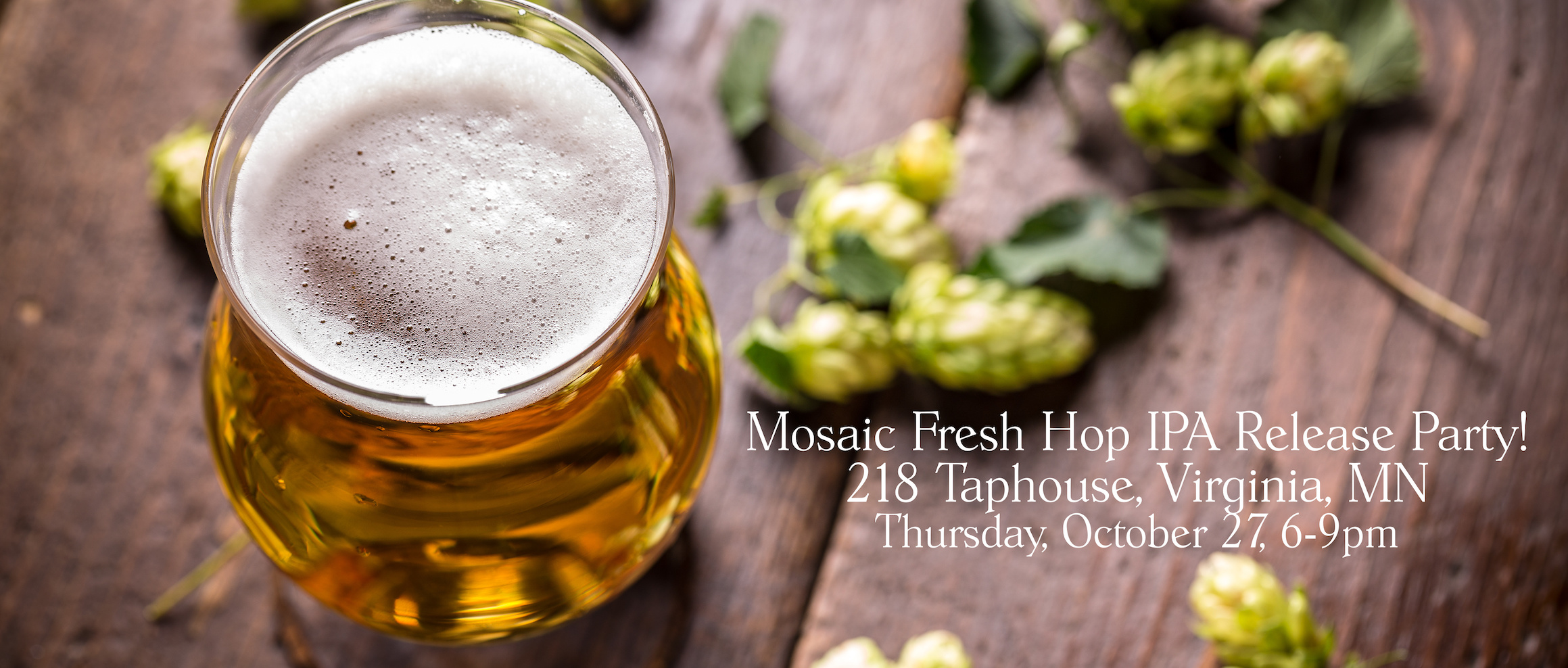 We’ve officially released our Mosaic Fresh Hop IPA and we’re celebrating! If you’re in the Virginia, MN area, come to 218 Taphouse on Thursday, October 27th from 6:00-9:00pm to drink some dangerously good Mosaic Fresh Hop IPA with us. See you there!